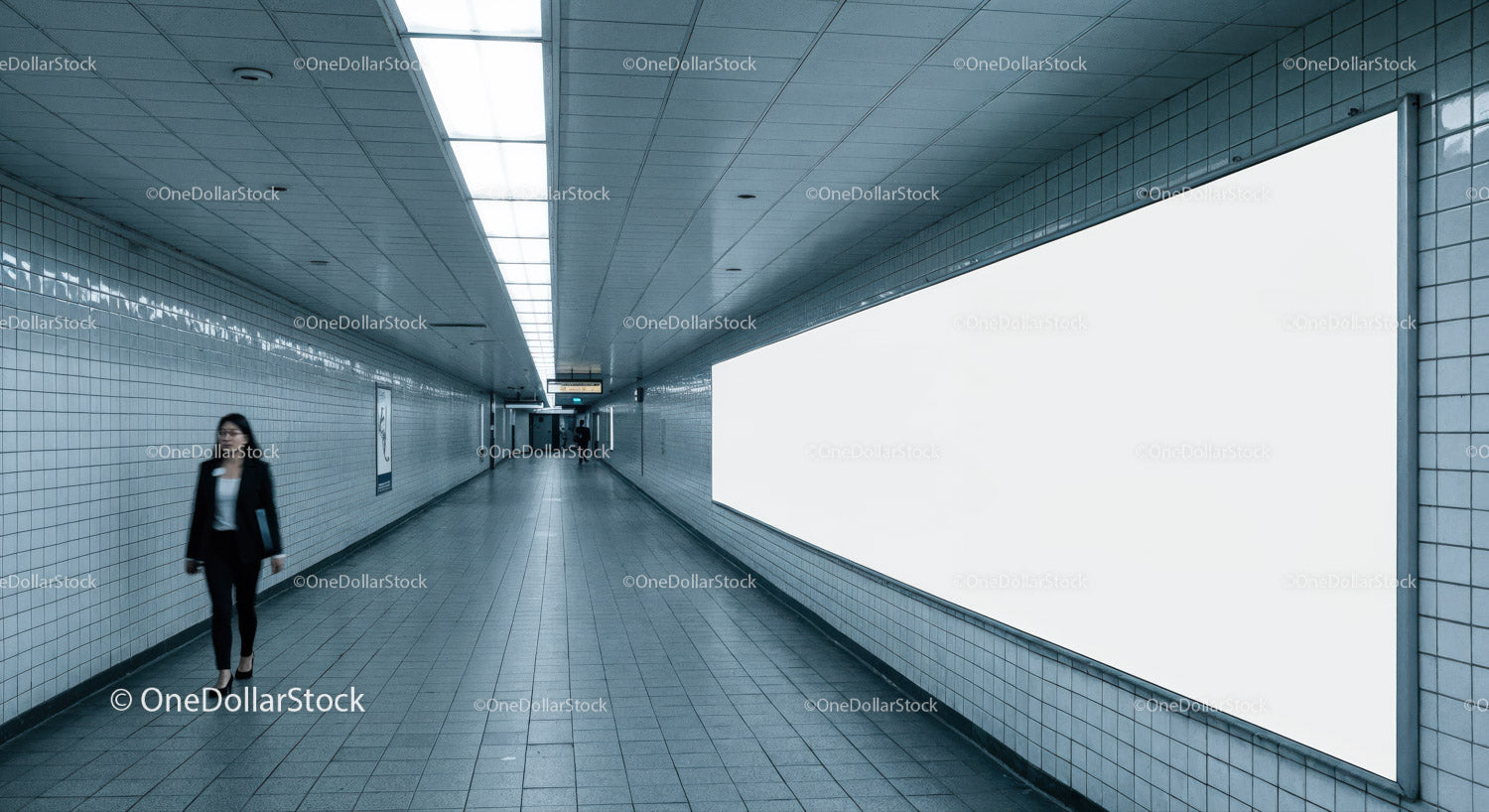 Nowoczesny tunel metra z kafelkowymi ścianami i idącą kobietą