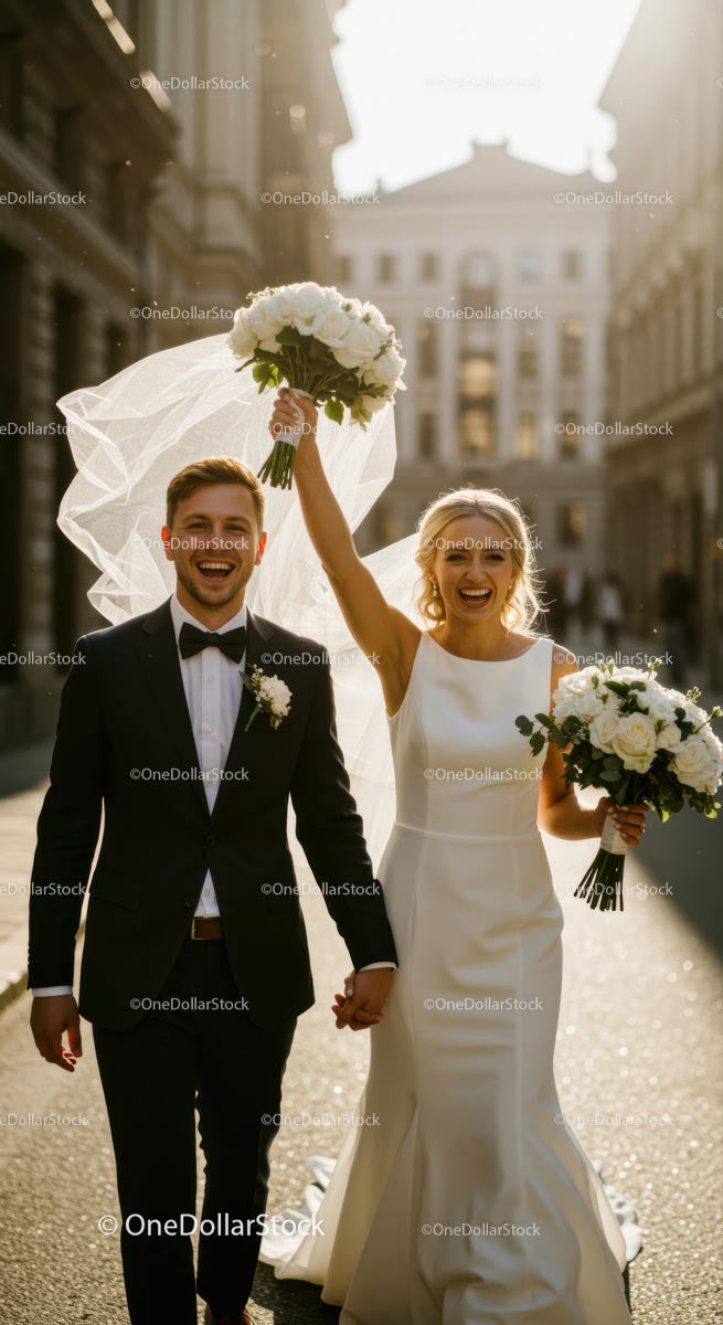 Nowożeńcy świętują na rozświetlonej słońcem ulicy miejskiej