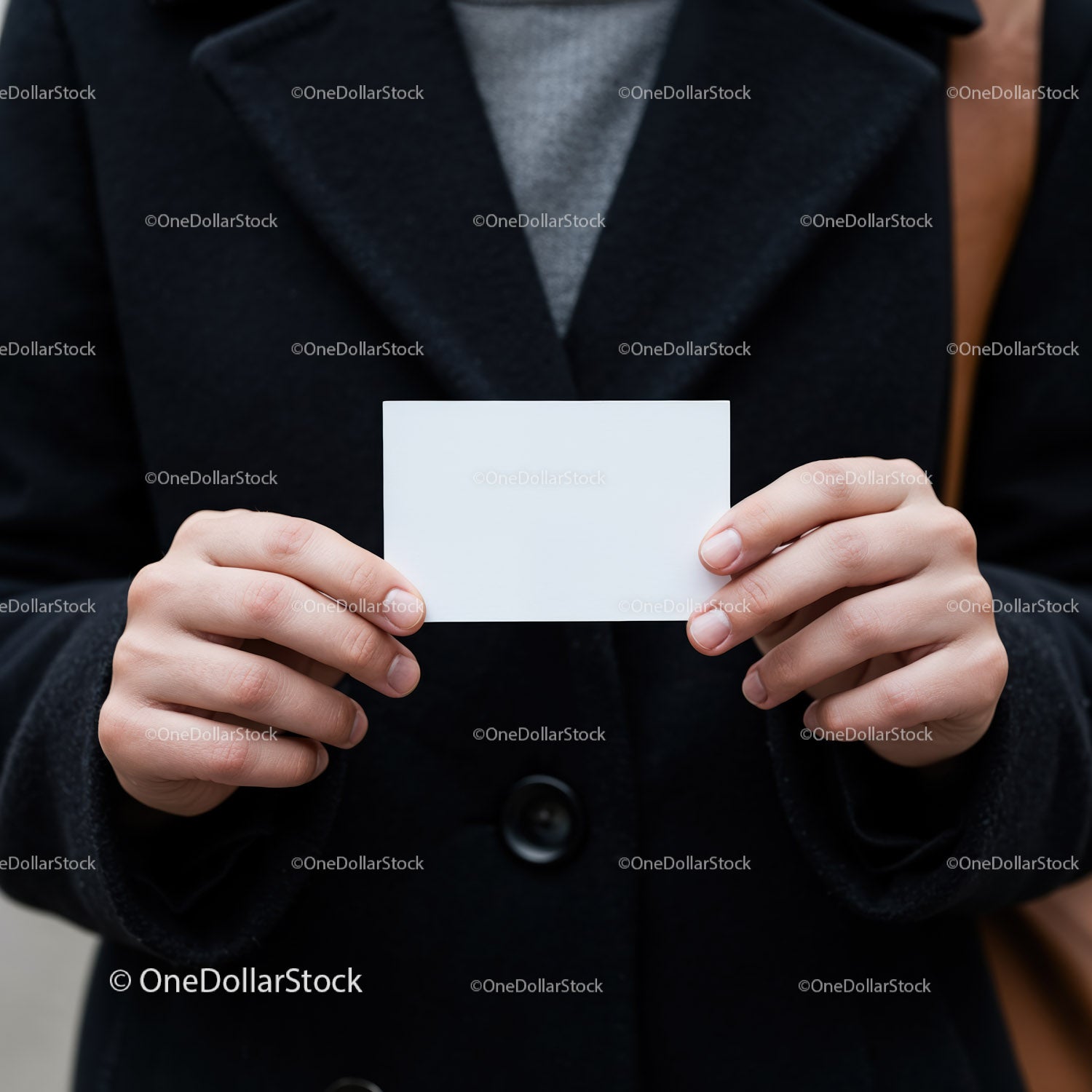 Zbliżenie ukazuje osobę ubraną w czarny płaszcz i szary sweter, trzymającą w obu dłoniach pustą, białą wizytówkę. Zdjęcie podkreśla prostotę i profesjonalizm, uwydatniając czystą, wyrazistą wizytówkę, która zachęca do personalizacji. Neutralne odcienie stroju kontrastują z jaskrawobiałą wizytówką, tworząc wyraźny punkt centralny. To oddaje poczucie gotowości do nawiązywania kontaktów, przedstawiania się lub udostępniania danych kontaktowych w minimalistycznym stylu. Naturalne oświetlenie podkreśla fakturę tkanin i skóry, przyczyniając się do autentycznego i przystępnego wrażenia.