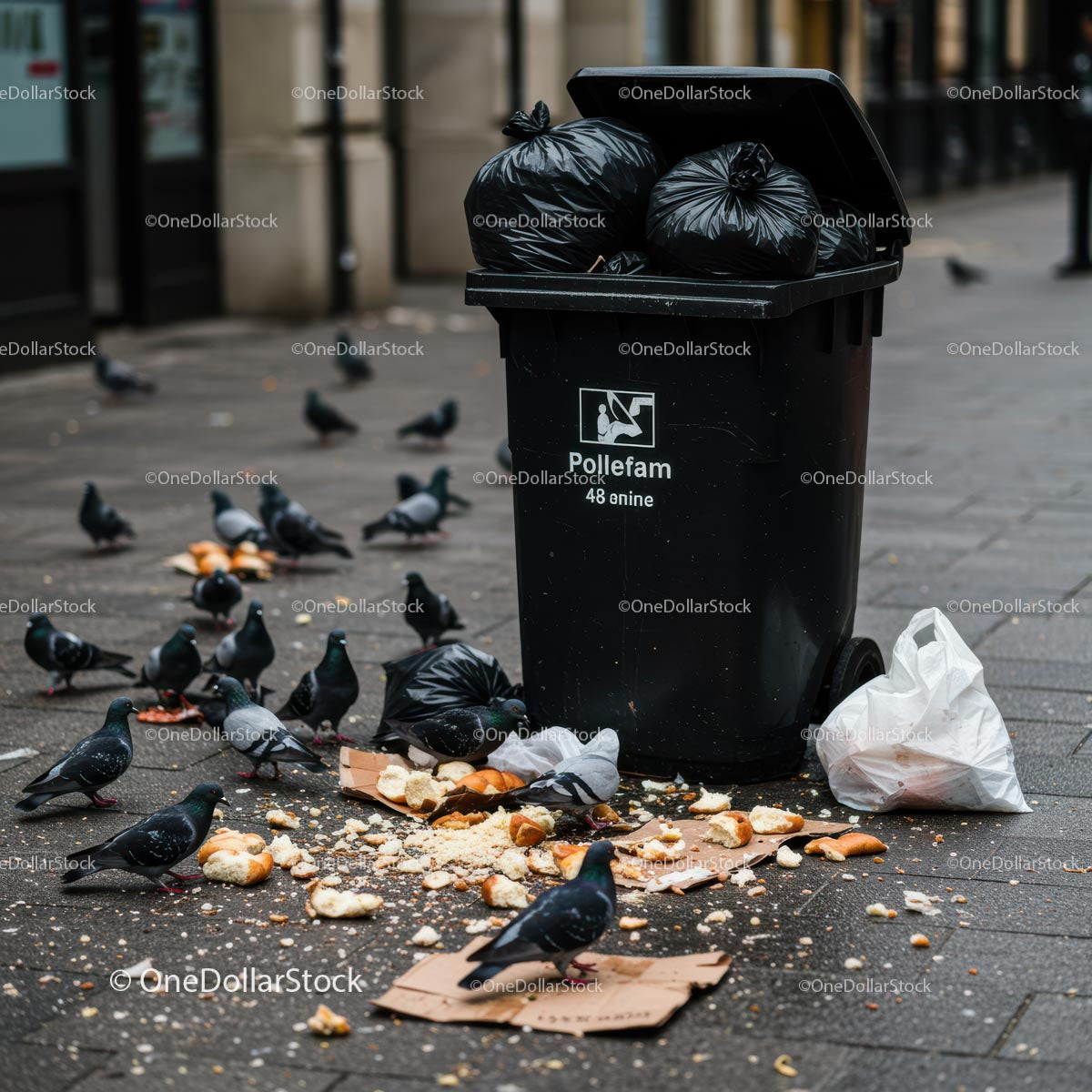 Gołębie karmiące się w pobliżu śmietnika na ulicy miejskiej