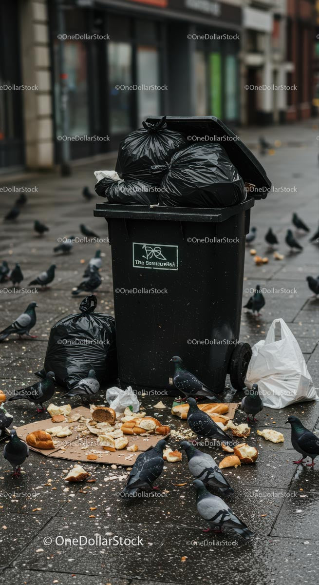 Gołębie żerujące w pobliżu przepełnionego śmietnika na ulicy miejskiej