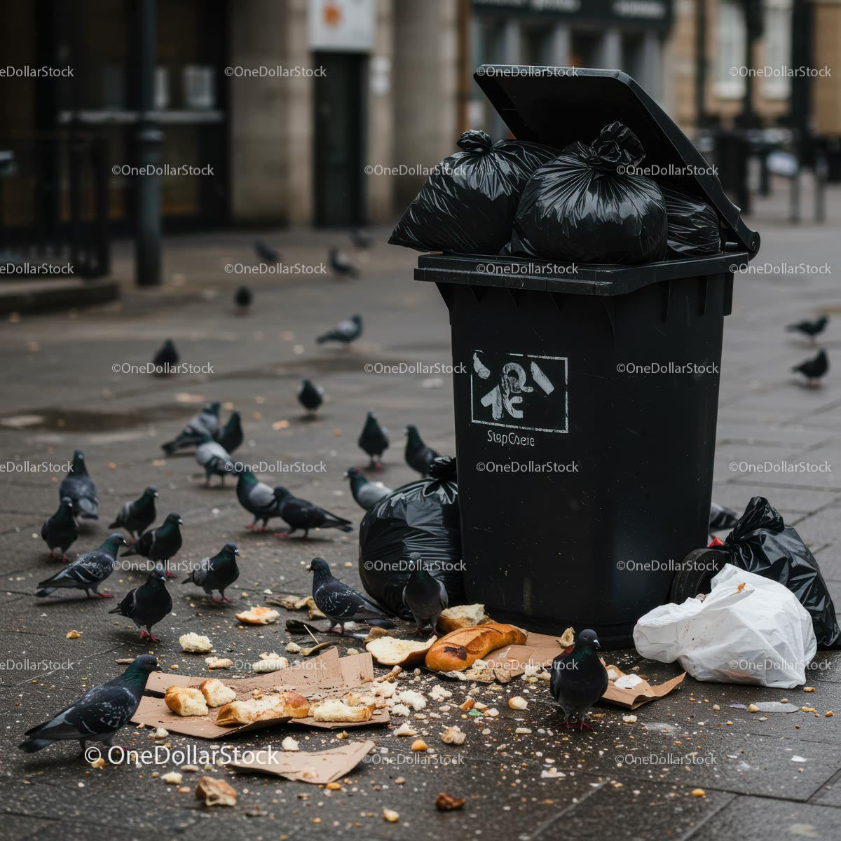 Gołębie żywiące się wyrzuconym jedzeniem w pobliżu śmietnika
