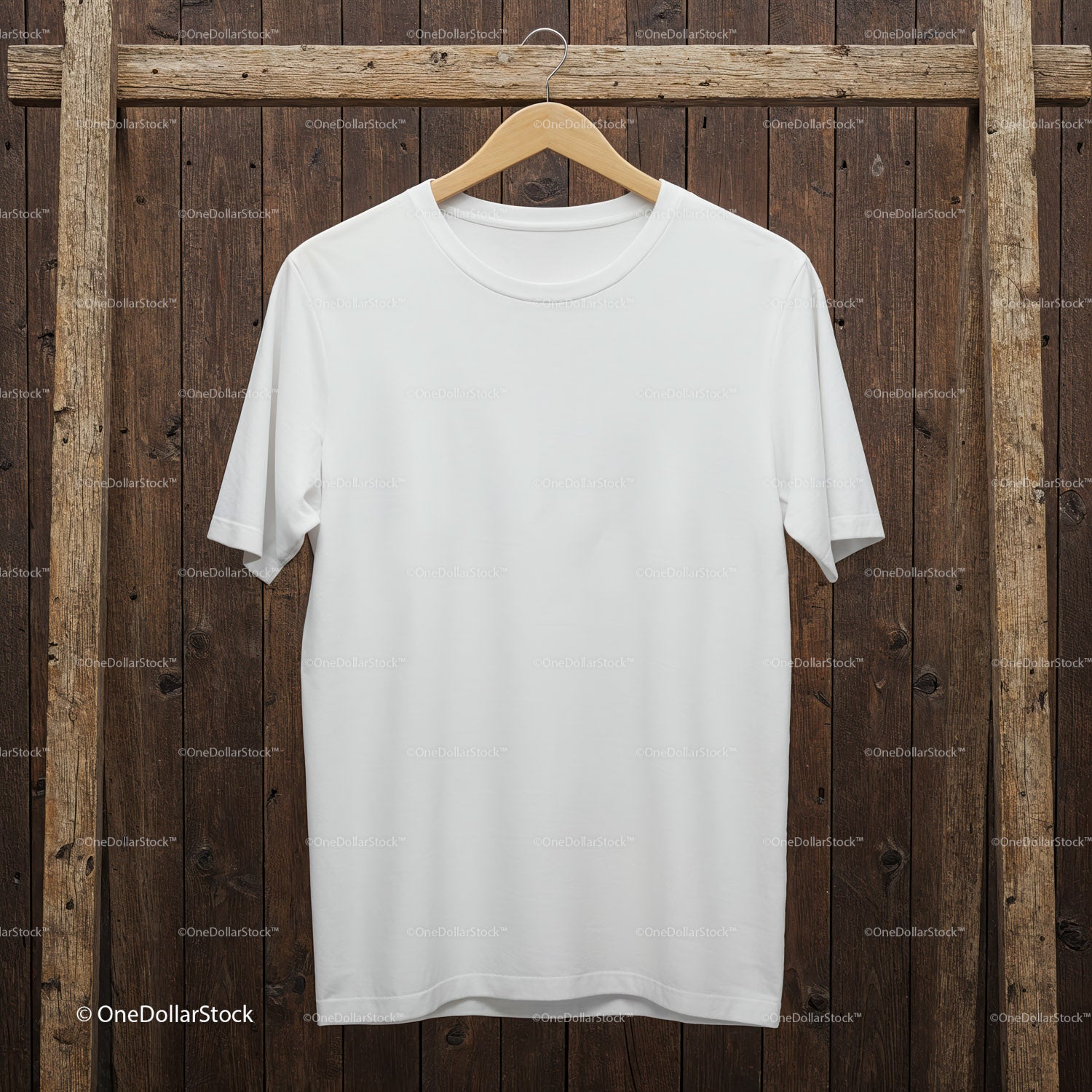 Prosta biała koszulka wisząca na rustykalnym drewnianym tle