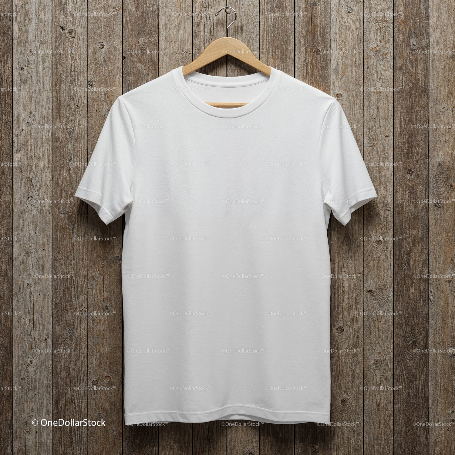 Zwykła biała koszulka wisząca na drewnianym tle