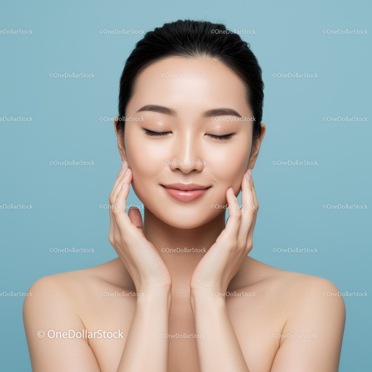 Portret spokojnej młodej kobiety o promiennej skórze i pogodnym wyrazie twarzy
