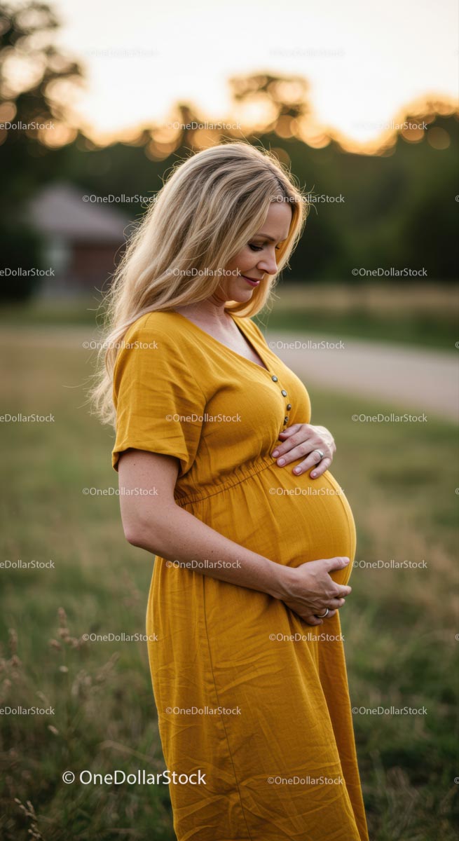 Kobieta w ciąży w żółtej sukience o spokojnym zachodzie słońca