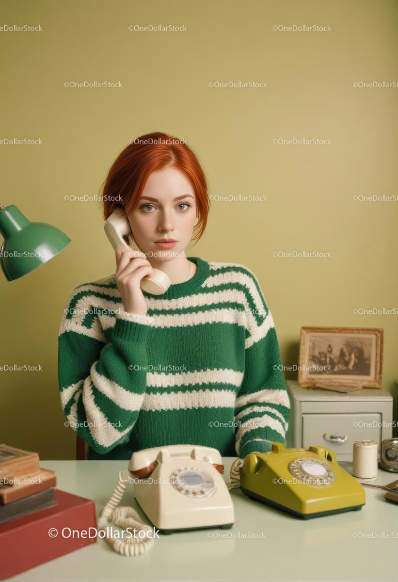 Rudowłosa kobieta w pasiastym swetrze z zabytkowym telefonem