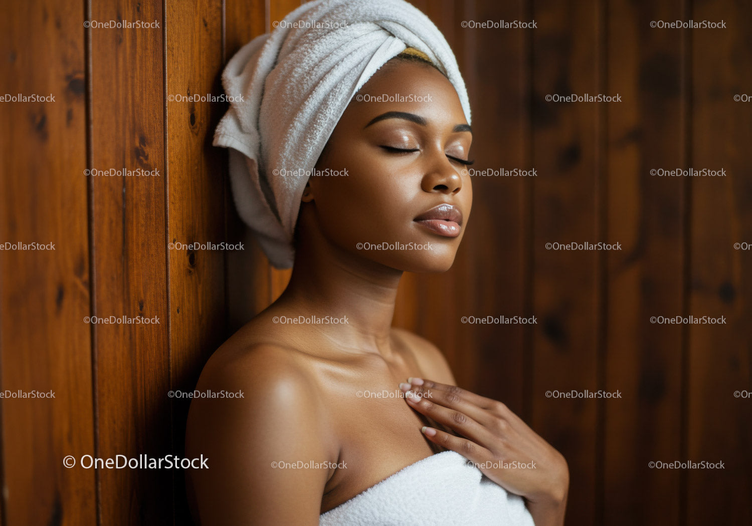 Zrelaksowana kobieta w ręczniku spa i owinięta ręcznikiem, korzystająca z zabiegów odnowy biologicznej
