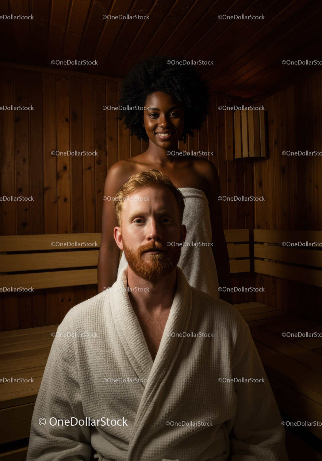 Relaksująca para w saunie spa z drewnianym wnętrzem