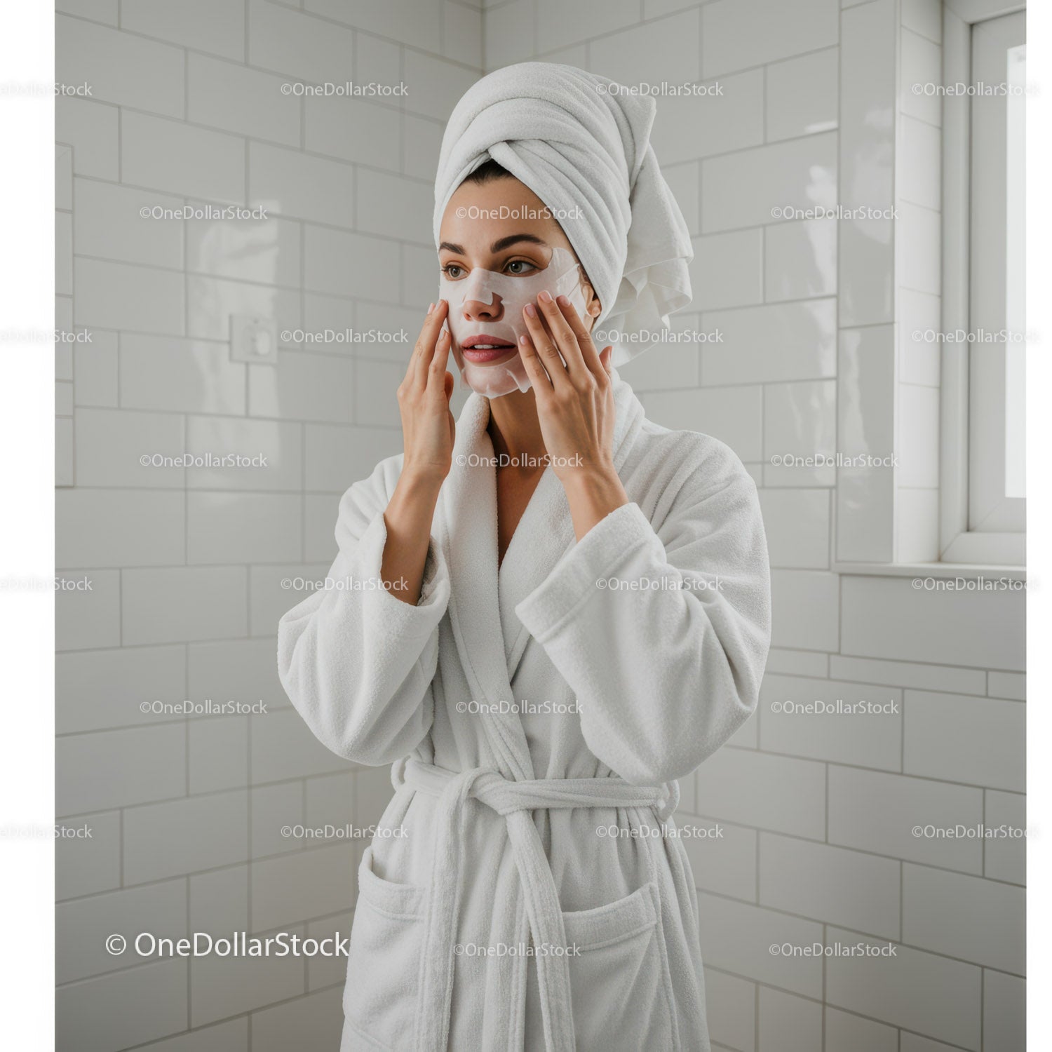 Relaksująca się kobieta nakładająca maseczkę na twarz w łazience