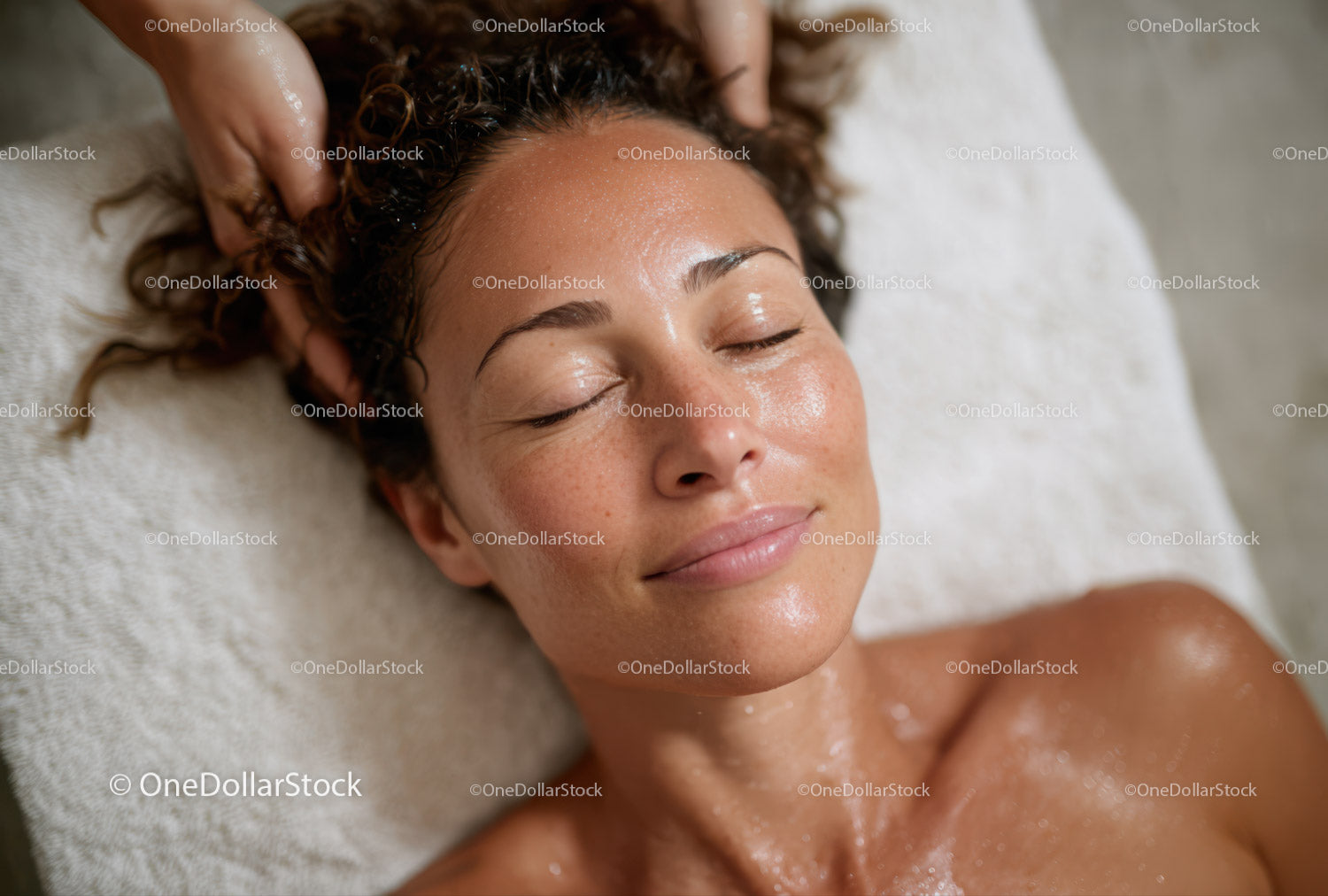 Relaksująca kobieta otrzymująca masaż twarzy w luksusowym spa