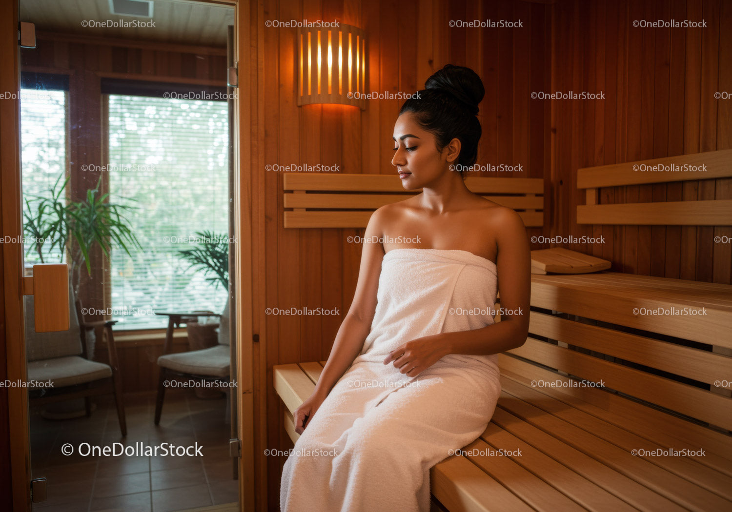 Relaksująca się kobieta siedząca w saunie z drewnianym wnętrzem