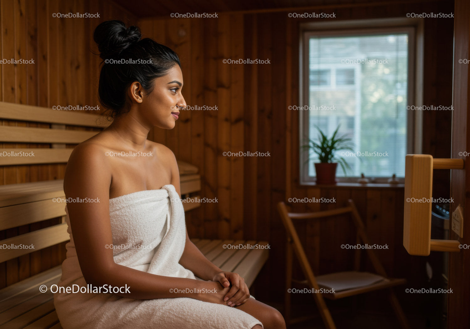 Relaksująca się kobieta siedząca w saunie z drewnianym wnętrzem i naturalnym światłem