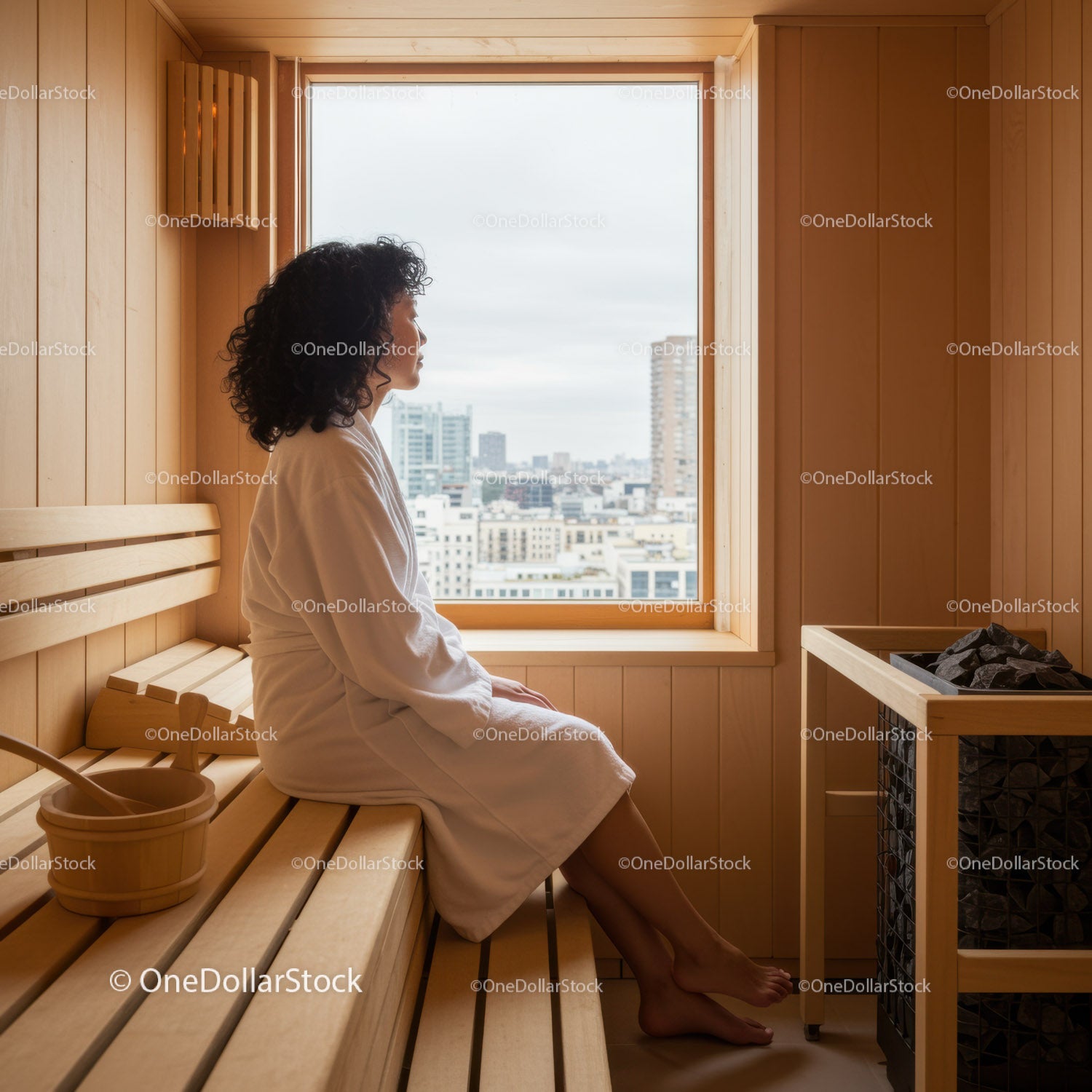 Relaksująca się kobieta siedząca w drewnianej saunie z widokiem na miasto