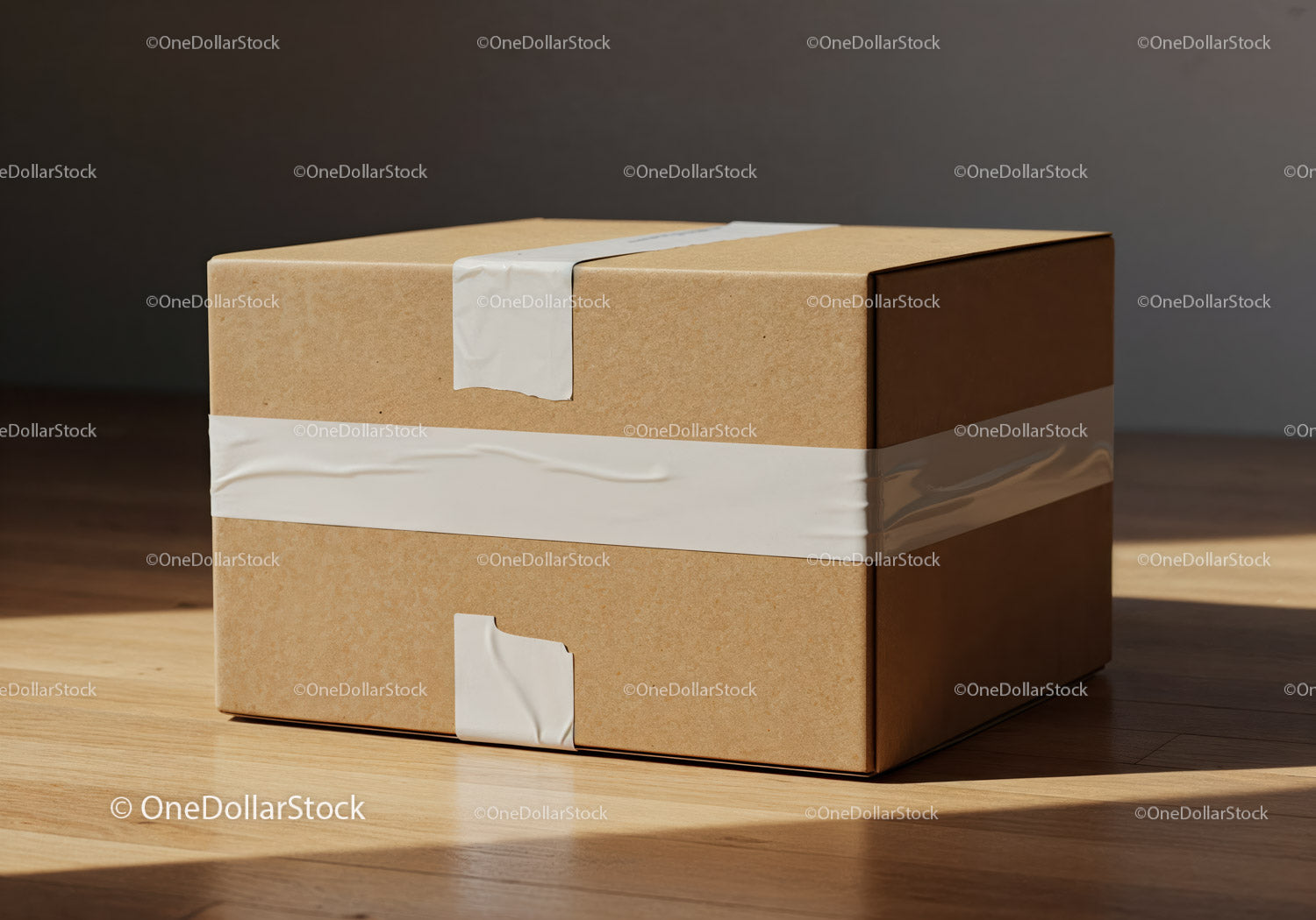 Zamknięte pudełko kartonowe na drewnianej podłodze z naturalnym światłem