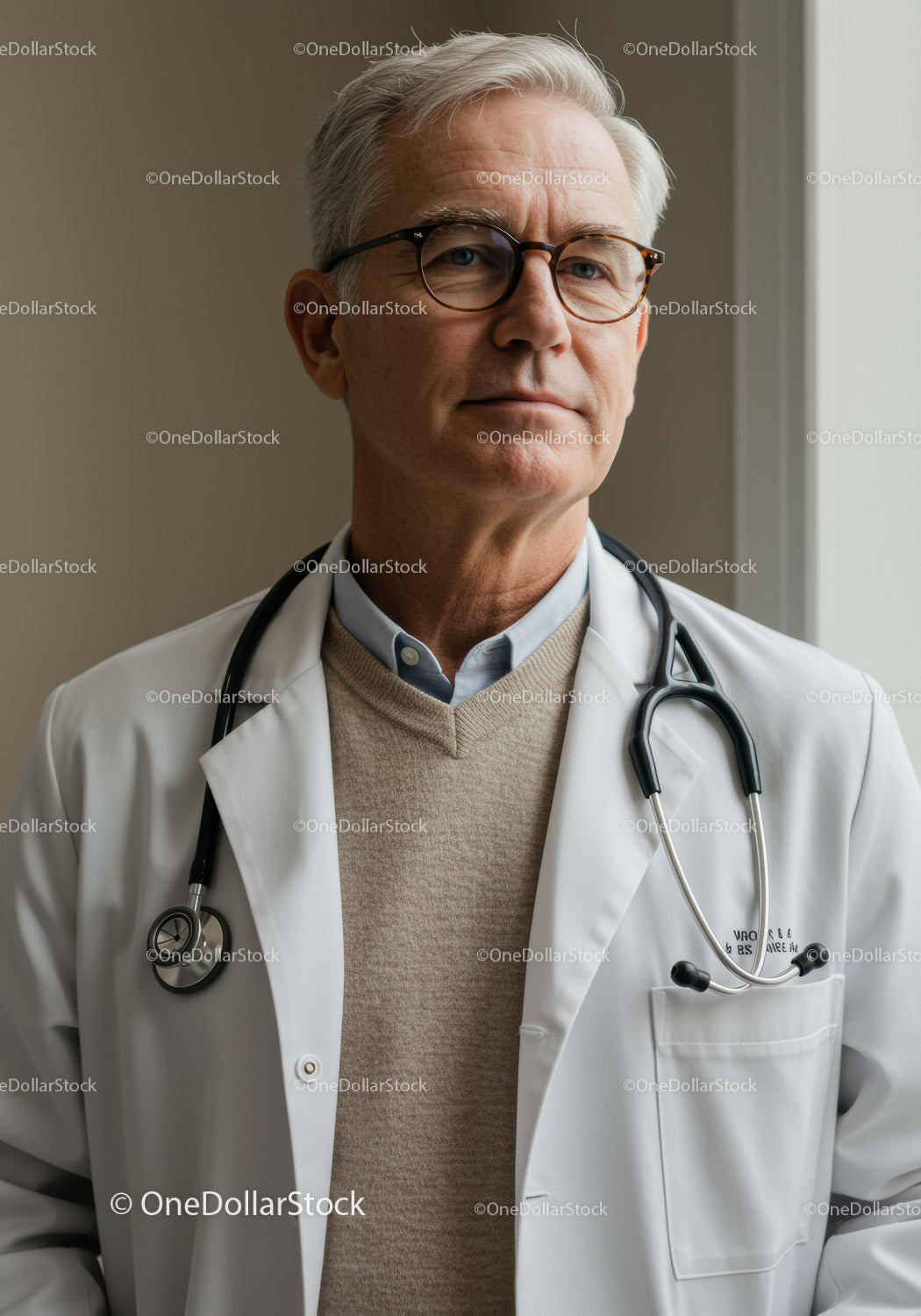 Pewny siebie starszy lekarz w okularach i białym fartuchu laboratoryjnym ze stetoskopem zawieszonym na szyi. Stoi w klinicznym otoczeniu z poważnym wyrazem twarzy, uosabiając profesjonalizm w opiece zdrowotnej. Tło sugeruje nowoczesny szpital lub gabinet lekarski, podkreślając tematykę wiedzy medycznej, opieki zdrowotnej i zaufania pacjentów. Idealne dla projektów związanych z opieką zdrowotną, personelem medycznym i szpitalem.