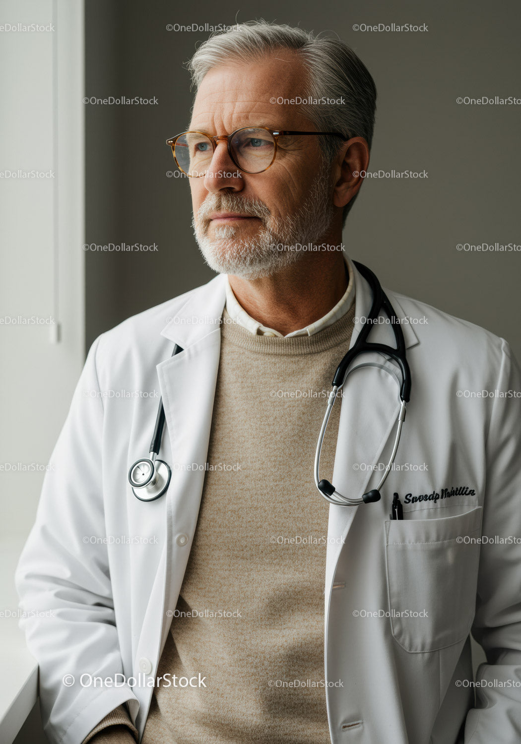 Starszy lekarz w białym fartuchu laboratoryjnym ze stetoskopem wyglądający na zamyślonego