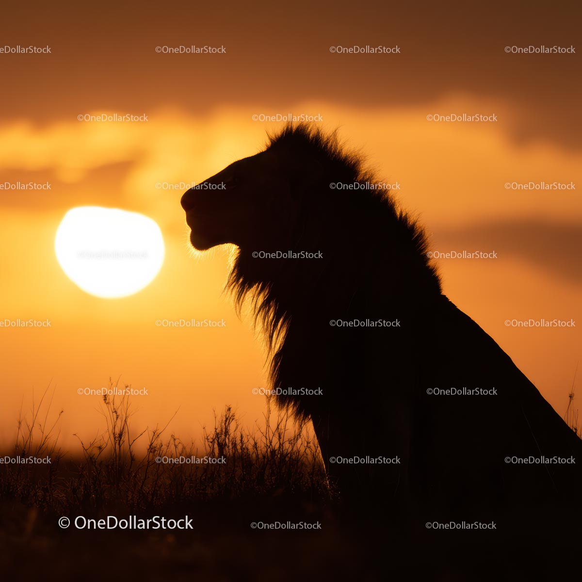 Sylwetka lwa o zachodzie słońca na afrykańskiej sawannie