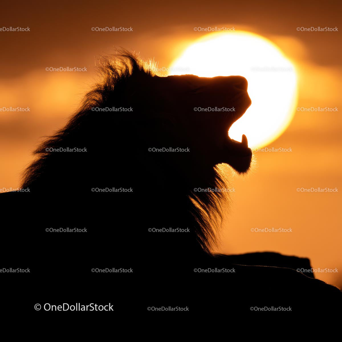 Sylwetka ryczącego lwa na tle złotego zachodu słońca
