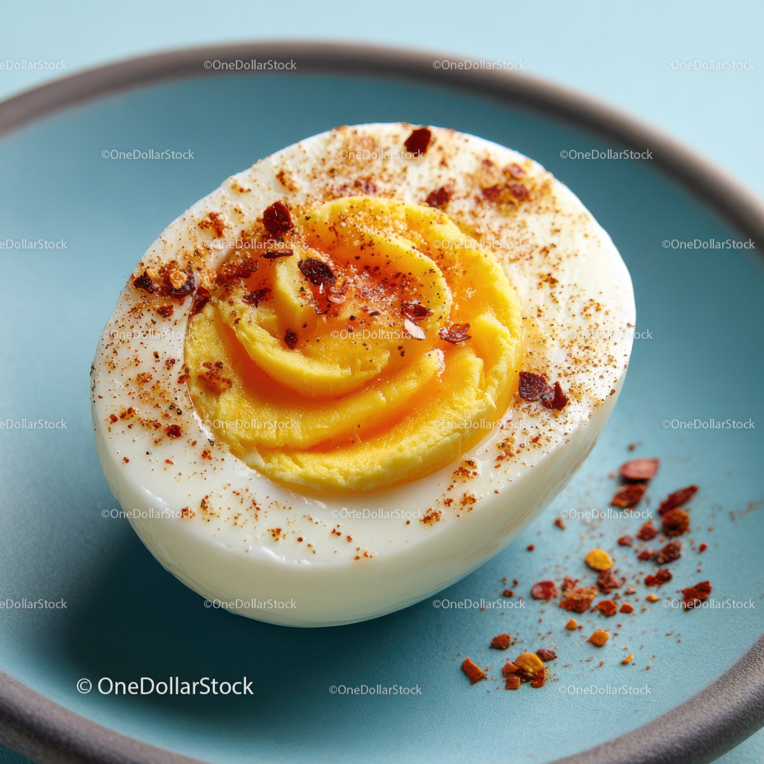 Pokrojone jajko gotowane z papryką i płatkami chili na niebieskim talerzu