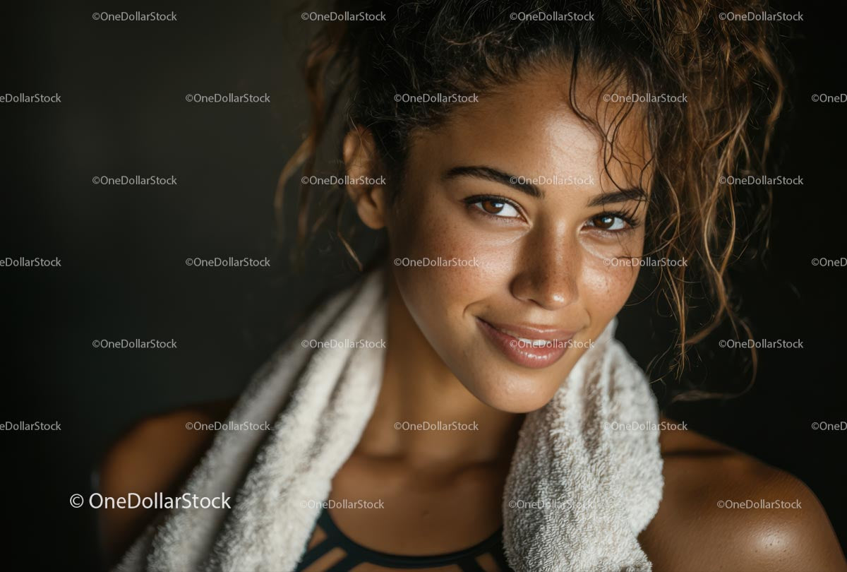 Uśmiechnięta wysportowana kobieta z ręcznikiem po treningu