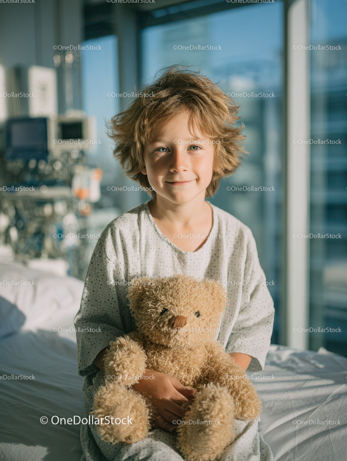 Uśmiechnięte dziecko z misiem w pokoju szpitalnym