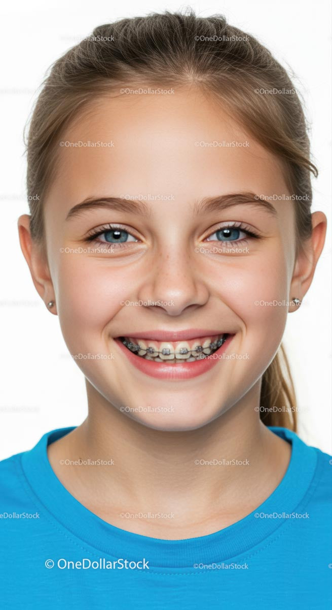 Uśmiechnięta dziewczyna z aparatem ortodontycznym i niebieskimi oczami