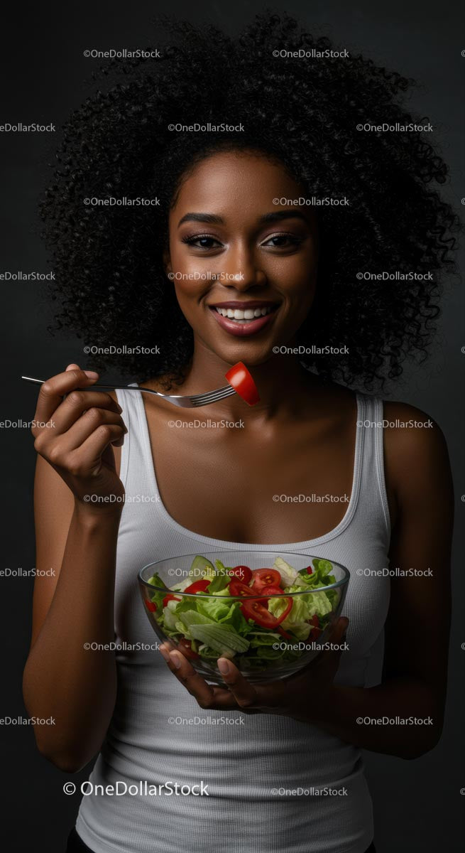 Uśmiechnięta kobieta delektująca się świeżą sałatką warzywną