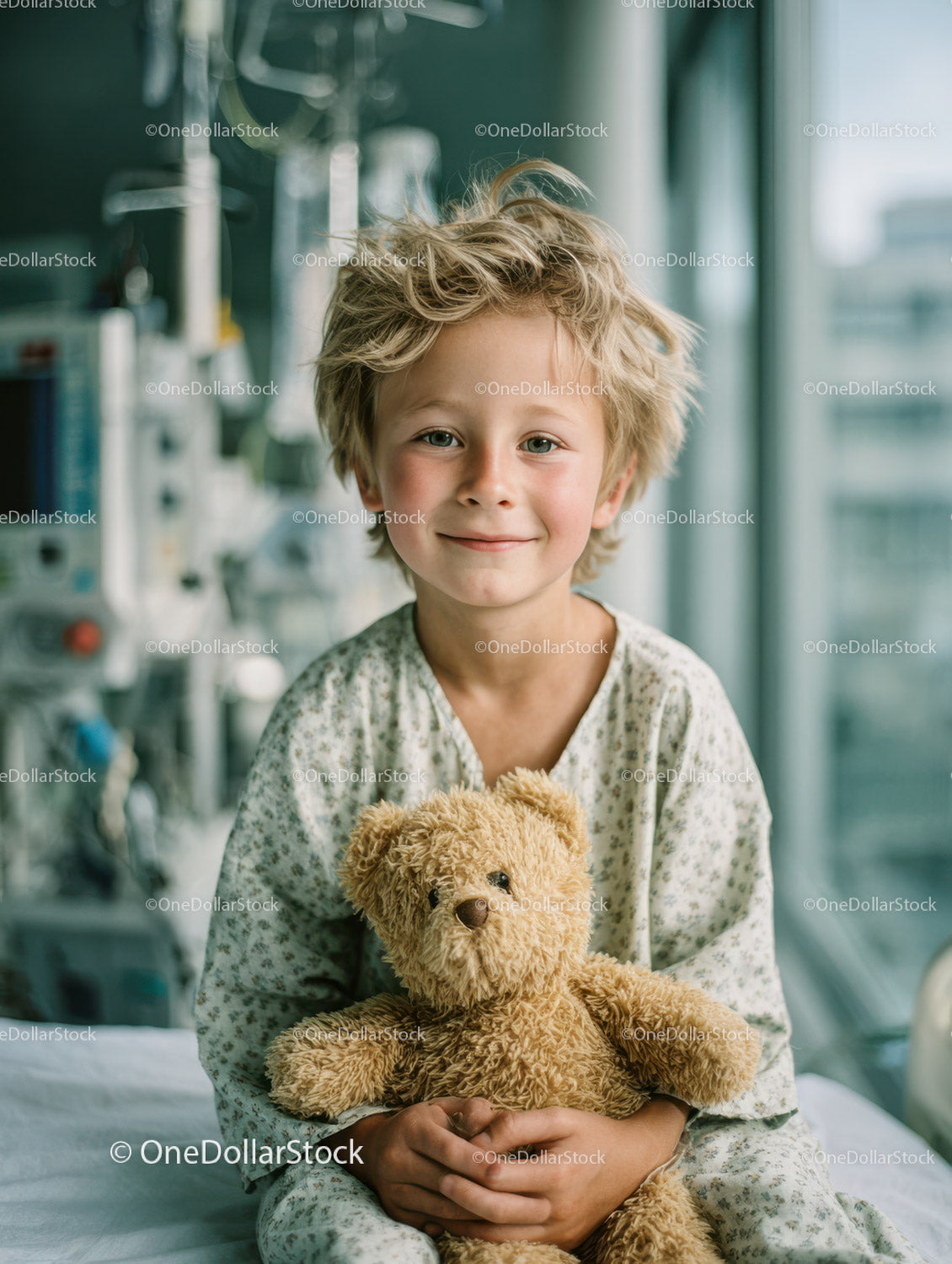 Uśmiechnięty chłopiec z misiem pluszowym w pokoju szpitalnym