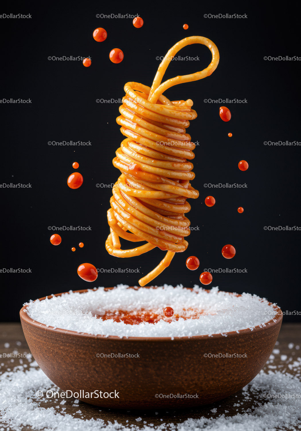 Makaron spiralny unoszący się nad miską z sosem i solą