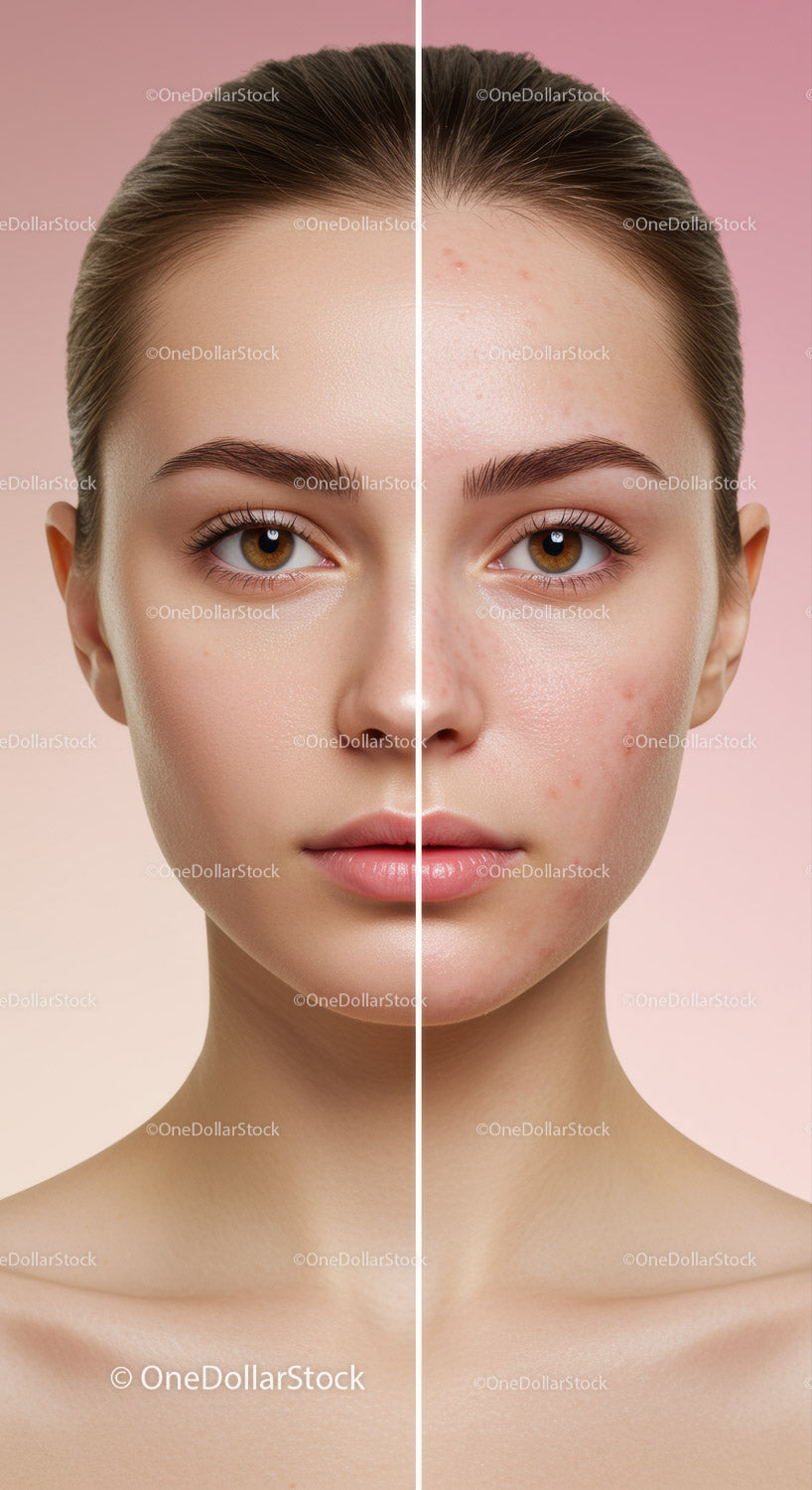 Podzielony obraz twarzy kobiety ukazujący czystą skórę i trądzik