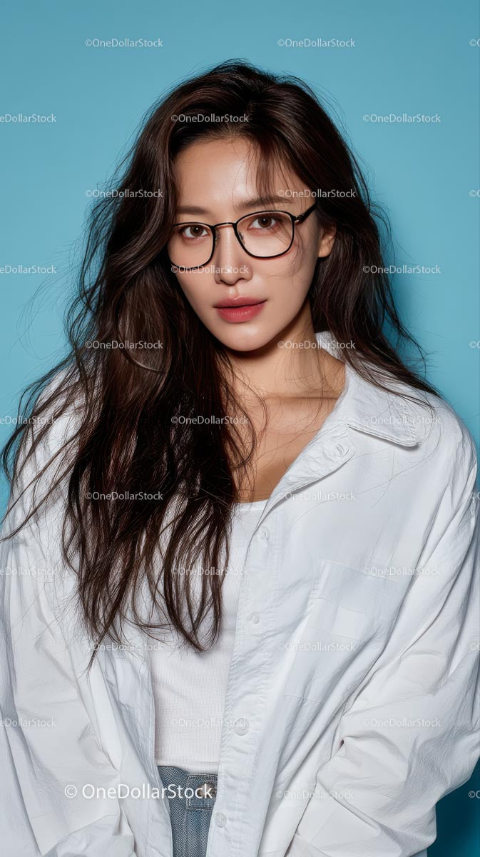 Stylowa kobieta w okularach z długimi włosami i białą koszulą
