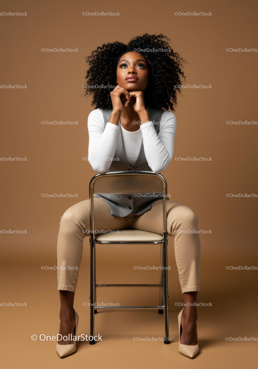 Stylowa kobieta siedząca na krześle z jasnymi, naturalnymi włosami i modnym strojem