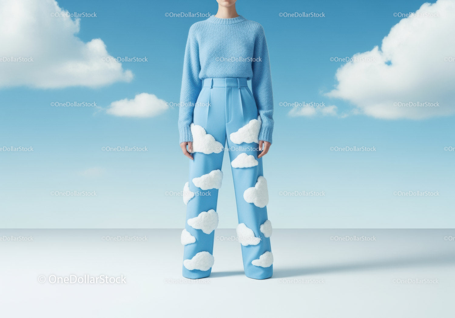Surrealistyczny strój modowy z niebieskimi spodniami i swetrem z motywem chmur