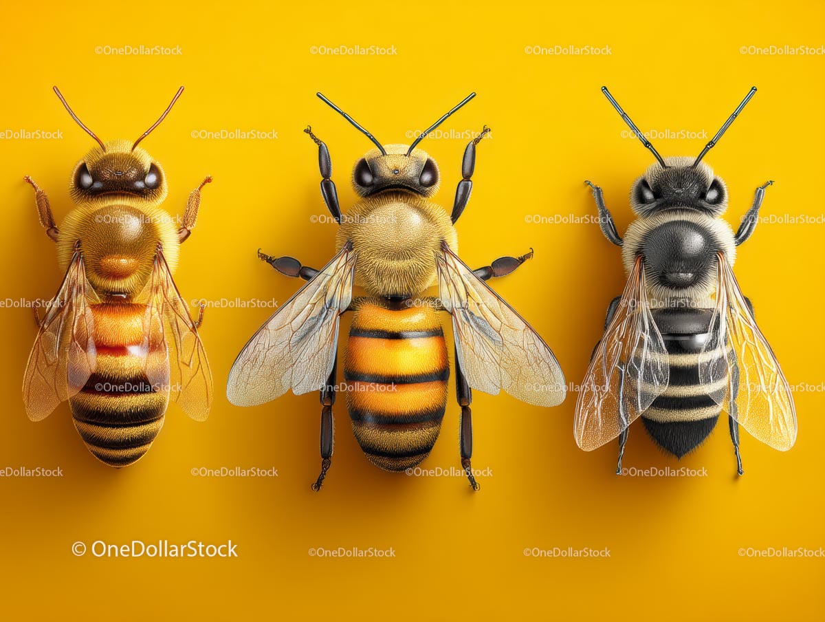 Trzy pszczoły miodne na jaskrawożółtym tle