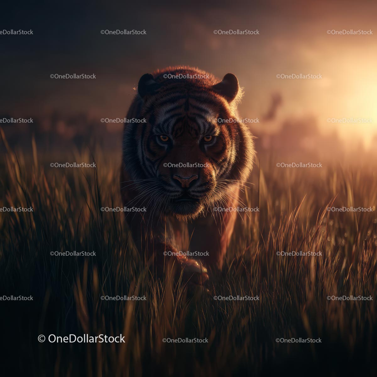 Tygrys przechadzający się po trawiastych równinach o zachodzie słońca