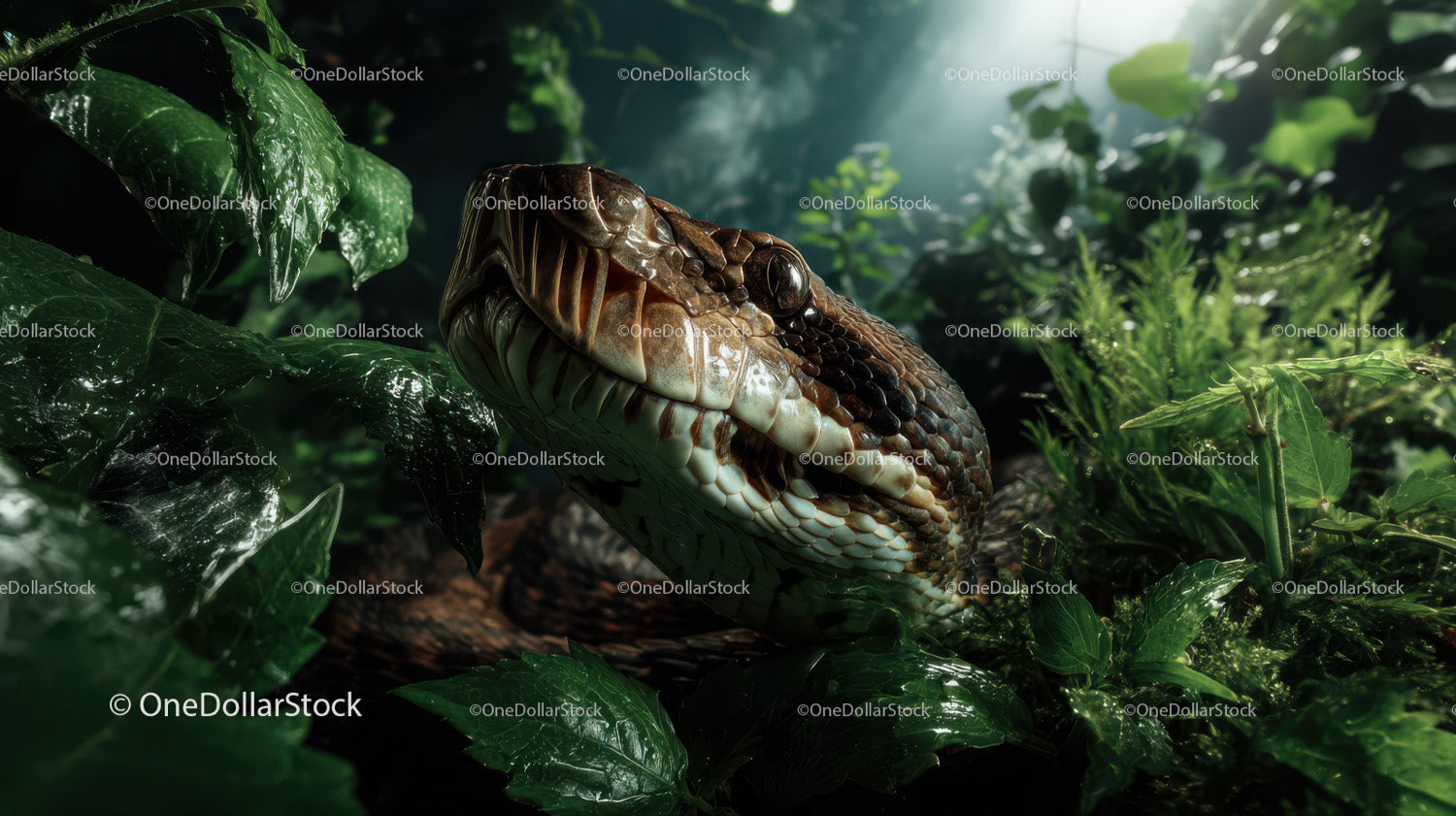 Pyton z tropikalnej dżungli ukryty wśród bujnych zielonych liści