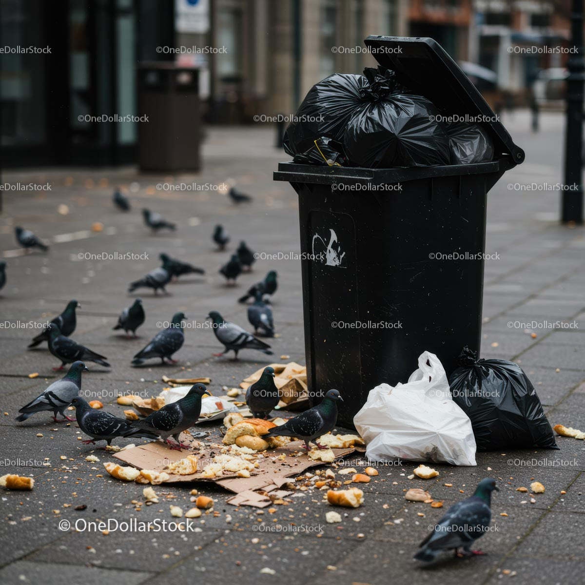 Gołębie gromadzą się wokół przepełnionego kosza na śmieci na miejskiej ulicy, szukając pożywienia pośród porzuconych przedmiotów. Scena podkreśla skrzyżowanie miejskiej przyrody z gospodarką odpadami, ilustrując wyzwania środowiskowe w przestrzeni publicznej. Obecność czarnych worków na śmieci i porozrzucanych śmieci kontrastuje z gwarem miasta, oferując autentyczny wgląd w codzienne życie w mieście.