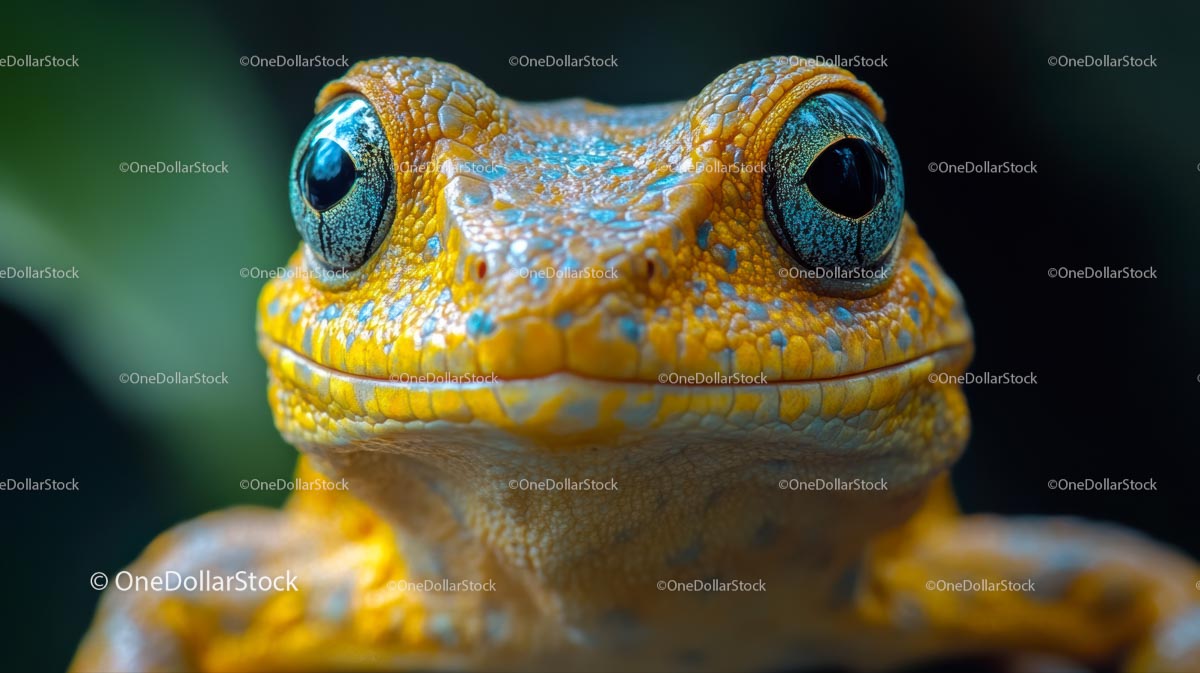 Żywe zbliżenie żółtej żaby z niebieskimi oczami
