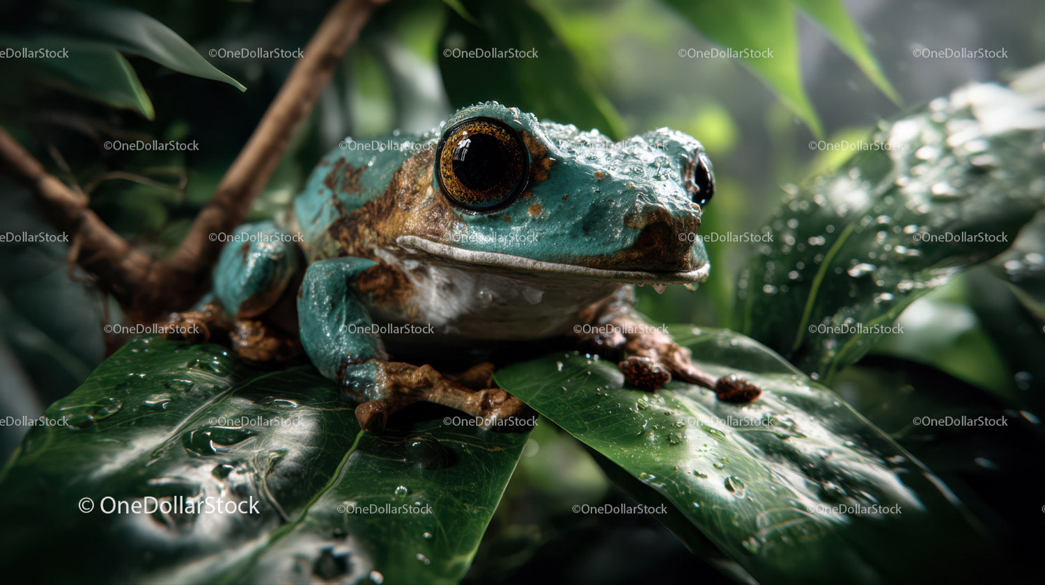 Jaskrawa zielona żaba odpoczywająca na bujnych tropikalnych liściach
