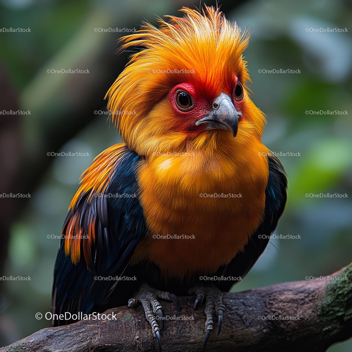 Żywy, pomarańczowy ptak czubaty siedzący w bujnej dżungli