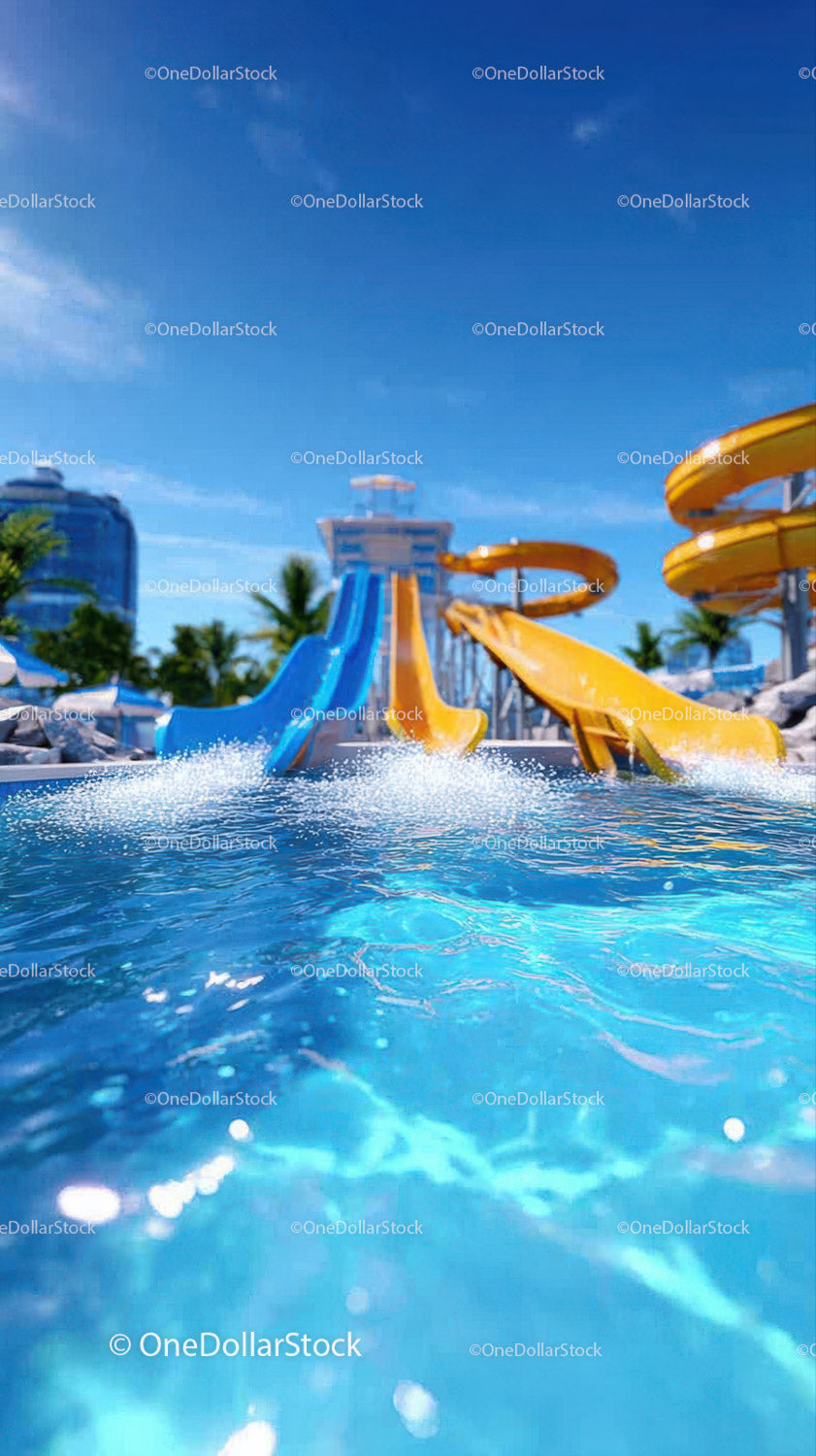 Tętniące życiem zjeżdżalnie w parku wodnym z jaskrawymi kolorami i pluskającą wodą