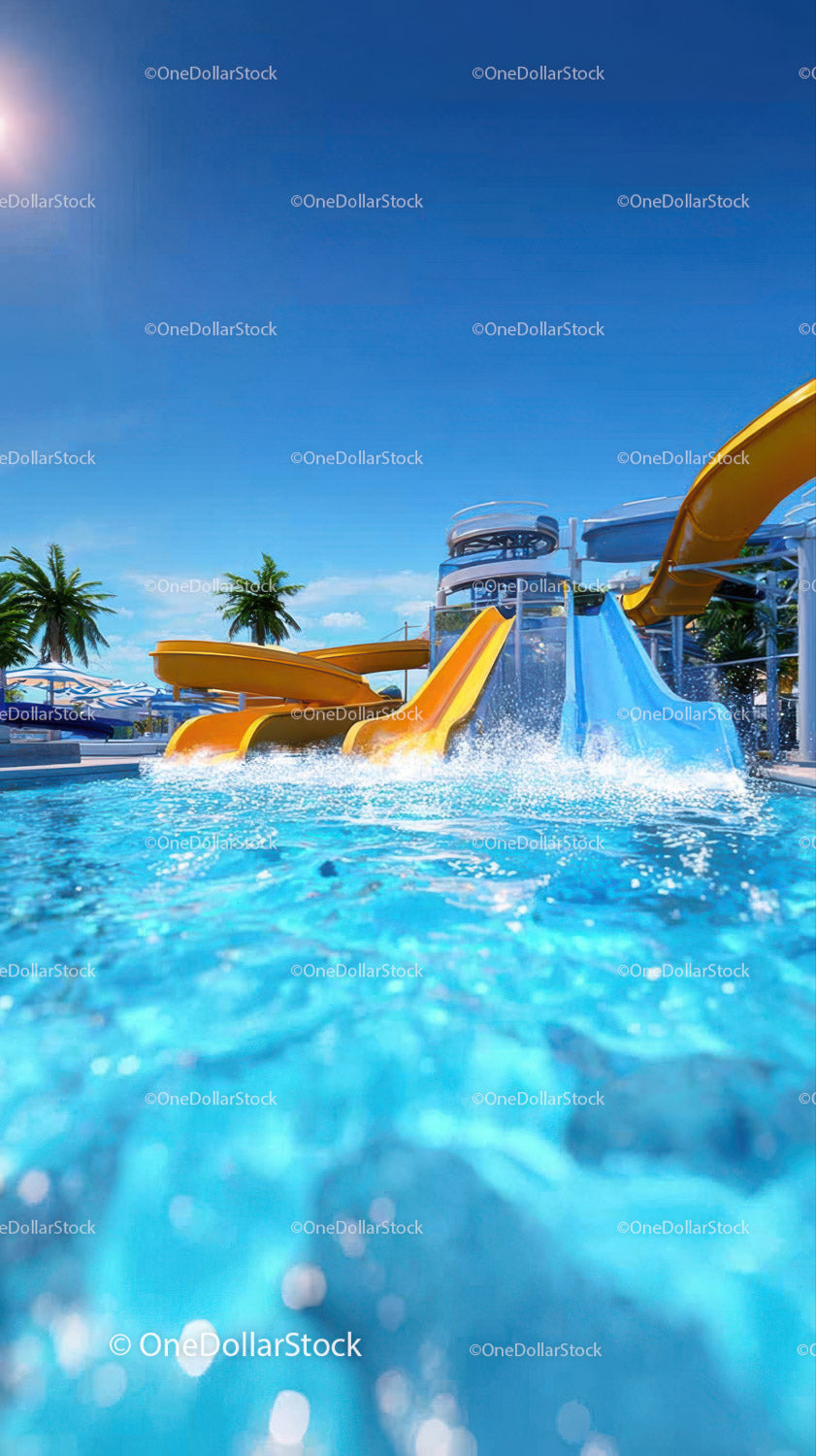 Tętniące życiem zjeżdżalnie wodne w parku wodnym na świeżym powietrzu w słoneczny dzień