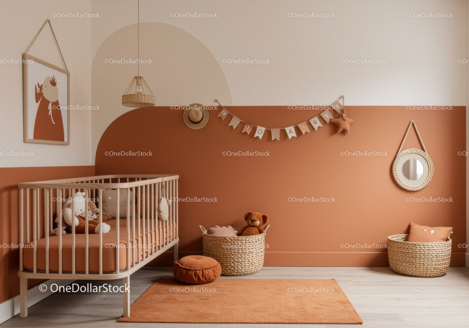 Ciepły pokój dziecięcy w odcieniach brzoskwini i beżu z plecionymi koszami i dekoracjami ściennymi
