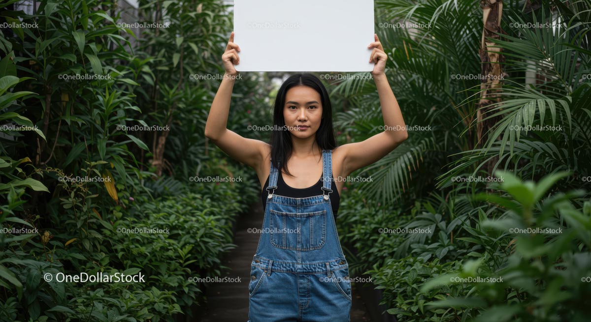 Kobieta trzymająca pusty znak wśród bujnej zieleni