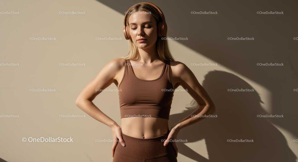 Kobieta w stroju fitness relaksuje się ze słuchawkami