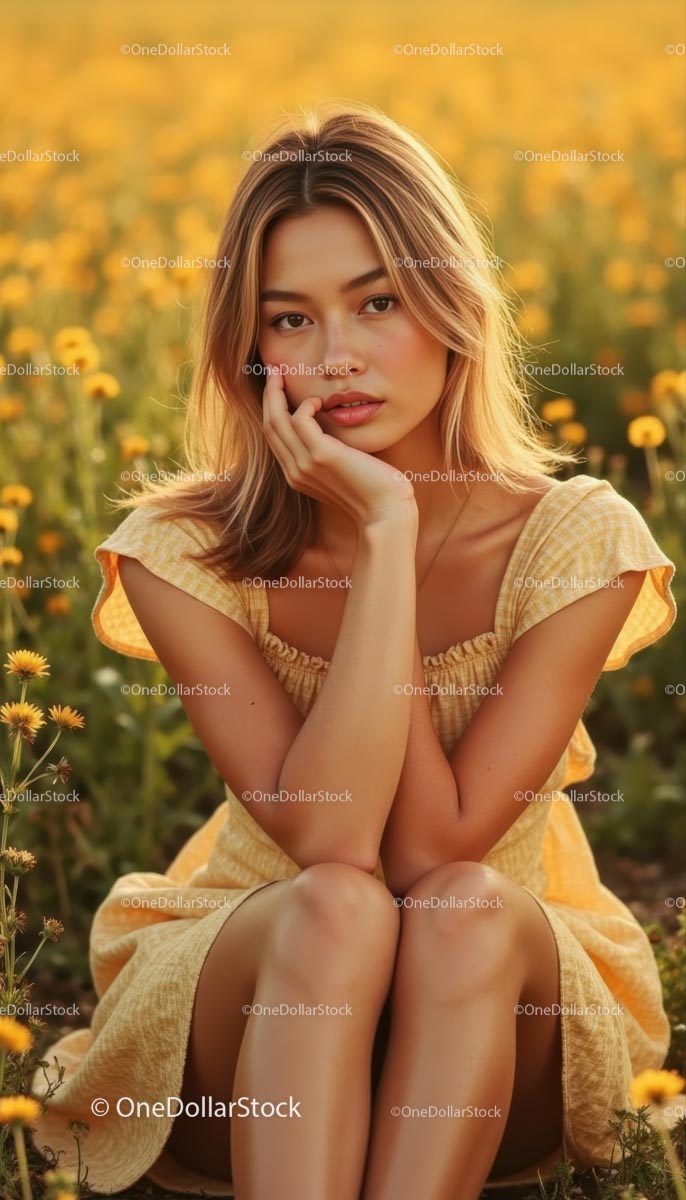 Kobieta w żółtej sukience otoczona kwitnącymi kwiatami