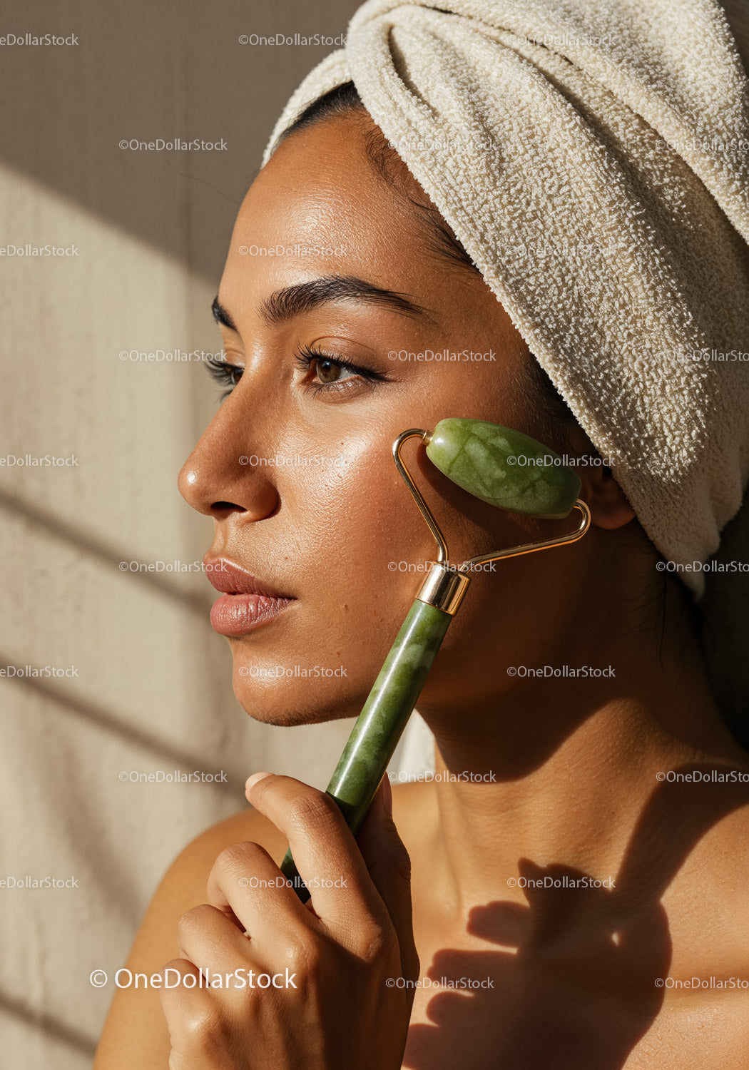 Zbliżenie na kobietę wykonującą masaż twarzy wałkiem jadeitowym, który sprzyja zdrowiu skóry i relaksowi. Ma gładką, promienną skórę i nosi miękki ręcznik owinięty wokół głowy. Scena emanuje uspokajającą atmosferą wellness, podkreślając dbałość o siebie i pielęgnację skóry. Naturalne światło słoneczne podkreśla promienną cerę kobiety, dzięki czemu zdjęcie idealnie nadaje się do tematów związanych z urodą, pielęgnacją skóry i wellness.