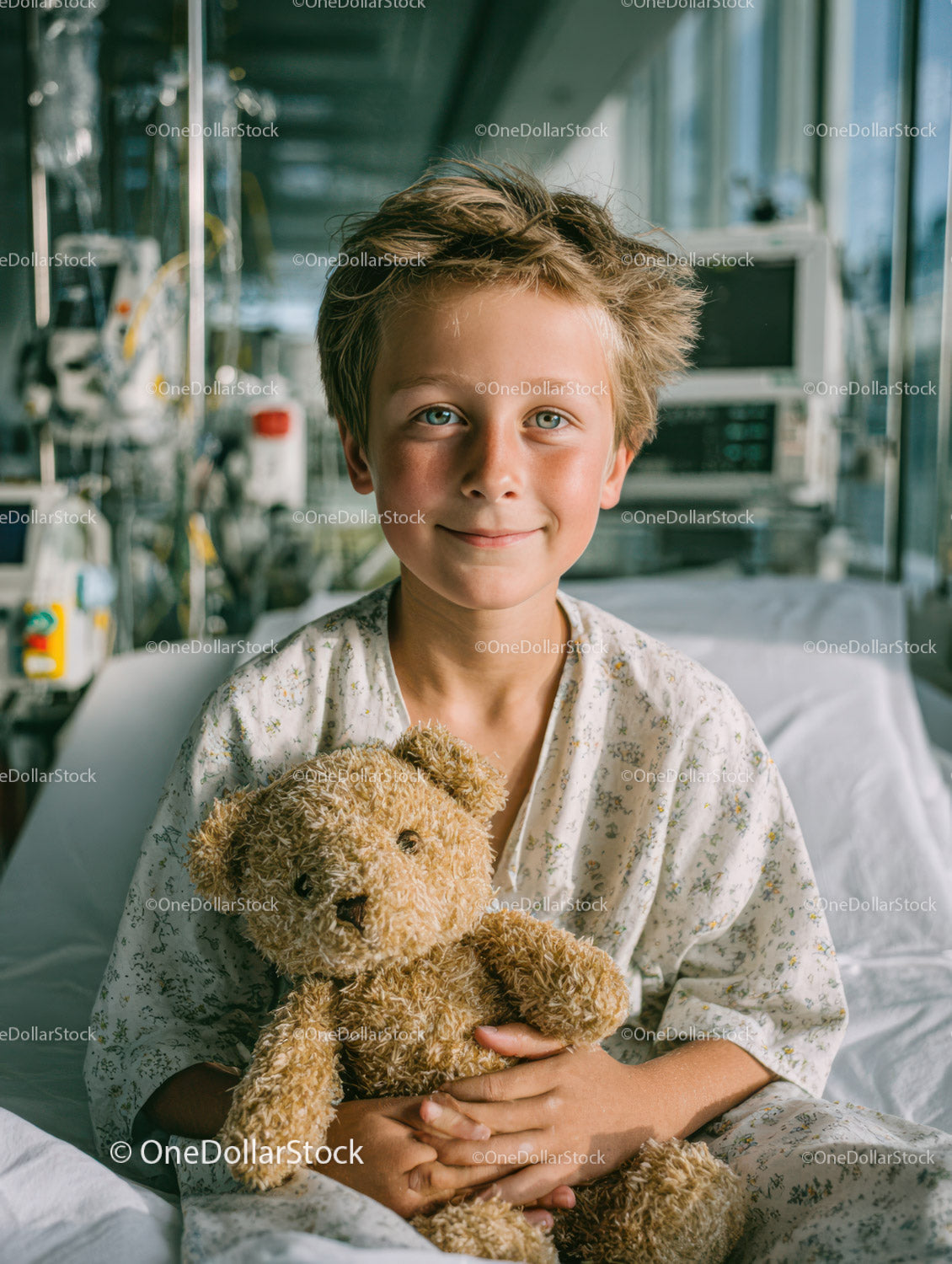 Młody chłopiec uśmiecha się na szpitalnym łóżku trzymając pluszowego misia