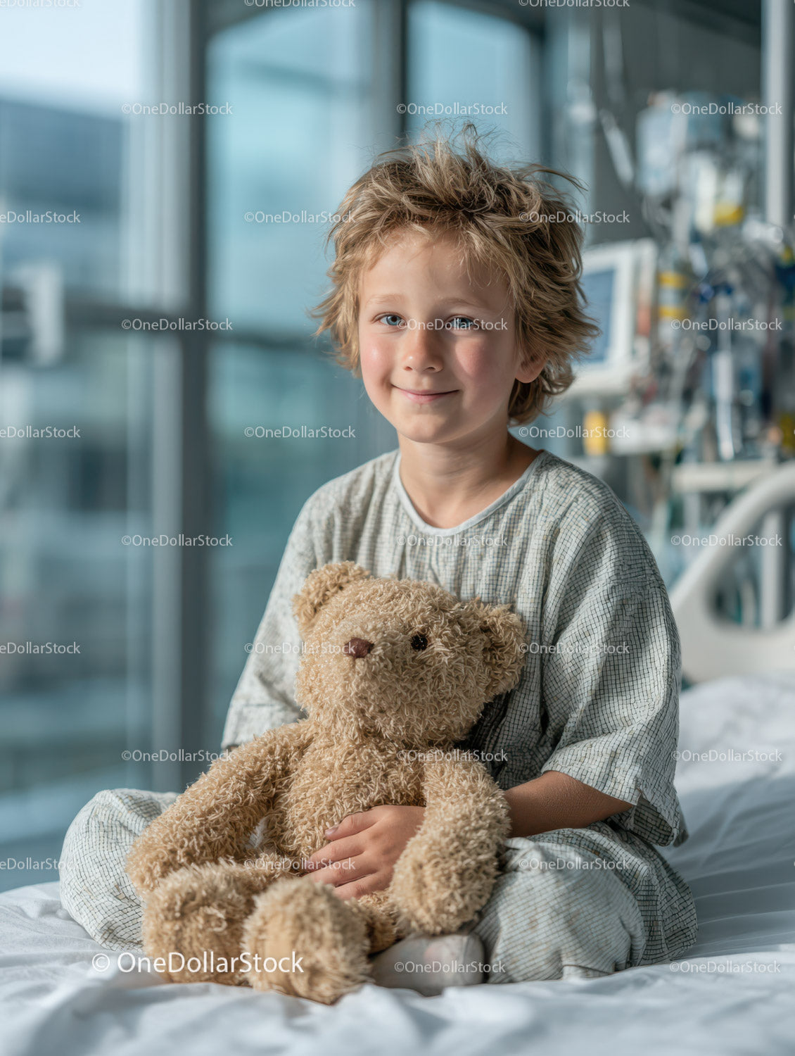 Chłopiec z misiem pluszowym w pokoju szpitalnym